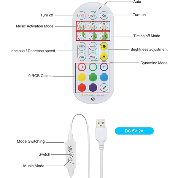 ریسه دارای ۱۴۰ افکت نوری دینامیک و ۱۸ افکت موزیکال است که با پخش موسیقی، به صورت هوشمند واکنش نشان میدهد و جلوههای نورپردازی ریتمیک ایجاد میکند. این قابلیت، ریسه را به انتخابی فوقالعاده برای مهمانیها، اتاق گیمینگ، جشنها یا محیطهای هنری تبدیل کرده است. اتصال آن از طریق درگاه USB انجام میشود، بنابراین میتوان آن را به پاوربانک، آداپتور موبایل، لپتاپ و سایر منابع تغذیه USB متصل کرد.