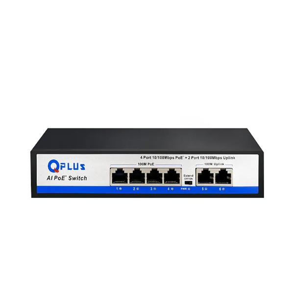مجهز به ۴ پورت اترنت PoE با سرعت ۱۰/۱۰۰ مگابیت بر ثانیه و ۲ پورت Uplink برای اتصال به روتر یا شبکههای گستردهتر، مناسب برای استفاده در دوربینهای مداربسته، VoIP و شبکههای کوچک.