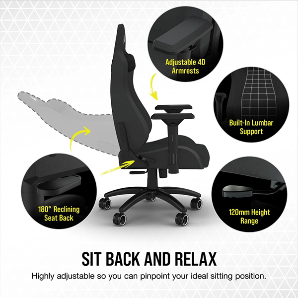 TC200 به پشتی قابل تنظیم با قابلیت خم شدن تا 180 درجه مجهز است تا کاربر بتواند وضعیت دلخواه خود را هنگام بازی، استراحت یا کار تنظیم کند. همچنین، دستههای قابل تنظیم چهاربعدی (4D) امکان تغییر در چهار جهت را فراهم میسازند تا ساعدها و آرنجها بهدرستی حمایت شوند. بالشتک پشتسری و پشتی کمری همراه با صندلی، فشارهای وارده به ستون فقرات و گردن را کاهش میدهند و از خستگی زودرس جلوگیری میکنند.