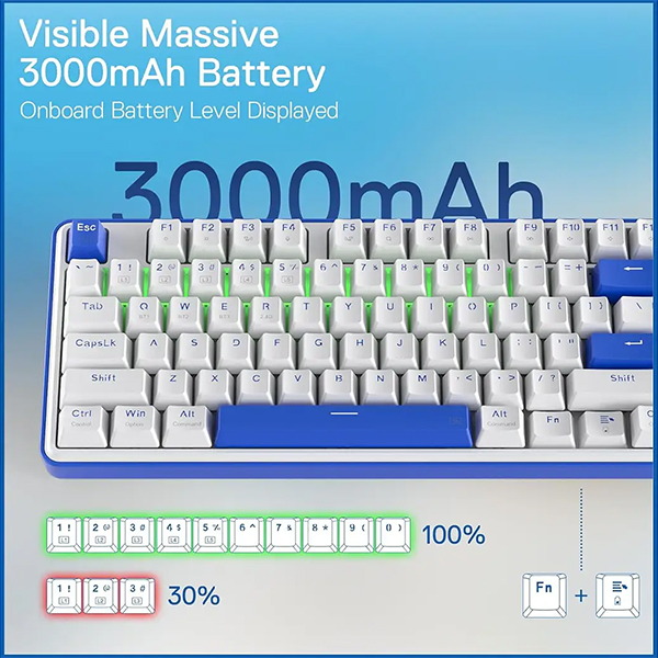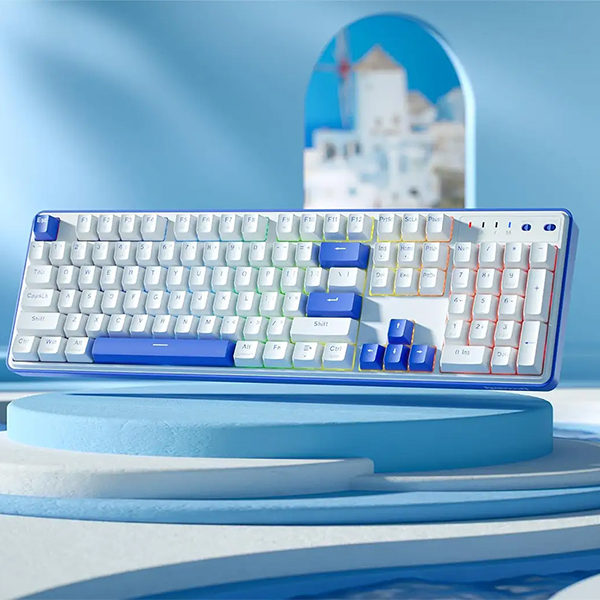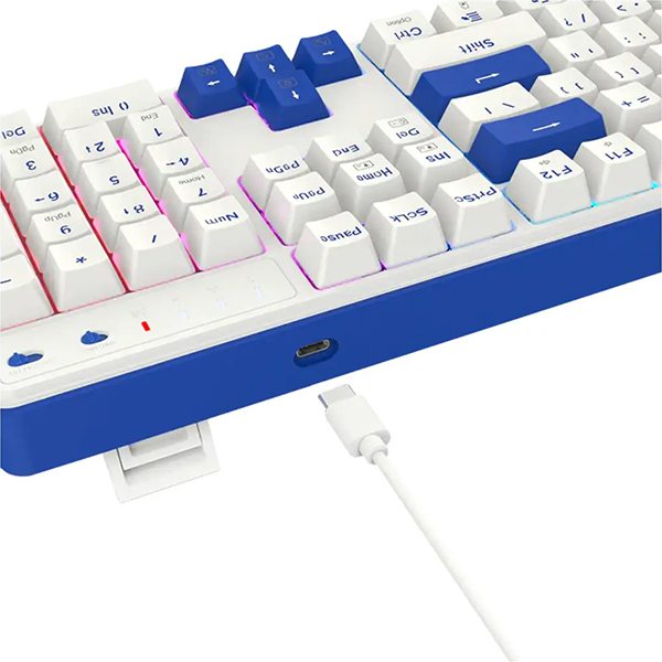 کیبورد K685 PRO RGB با ظاهر خاص و ترکیب رنگ‌های آبی و سفید، نمایی مدرن و چشم‌نواز به میز کار یا گیمینگ شما می‌دهد. نورپردازی RGB قابل تنظیم این مدل با جلوه‌های نوری متنوع، امکان خلق محیطی منحصربه‌فرد و مطابق با سلیقه‌ی شخصی شما را فراهم کرده است.