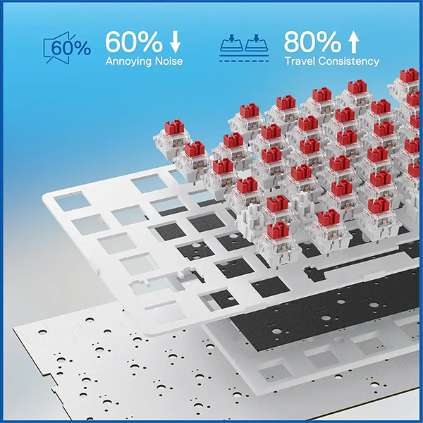 استفاده از ساختار گسکت و وجود سه لایه جاذب صدا شامل پد ضخیم 3.5 میلی‌متری و دو لایه فوم صداگیر، باعث شده تا این کیبورد تجربه تایپ نرم‌تر، منعطف‌تر و بسیار بی‌صداتری نسبت به بسیاری از مدل‌های مشابه ارائه کند. این ویژگی به‌ویژه برای استفاده طولانی و محیط‌های کاری یا گیمینگ شبانه بسیار ارزشمند است.