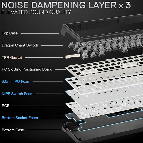 در داخل کیبورد K709 RGB سه لایه جاذب صدا قرار داده شده است که به کاهش نویزهای اضافی کمک میکند. این لایهها شامل فوم PO با ضخامت 3.5 میلیمتر، فوم IXPE، و فوم زیر سوکت هستند. این لایهها باعث میشوند که صدای کلیدها هنگام فشرده شدن کمتر باشد و تمرکز بیشتری در هنگام بازی یا کار داشته باشید.