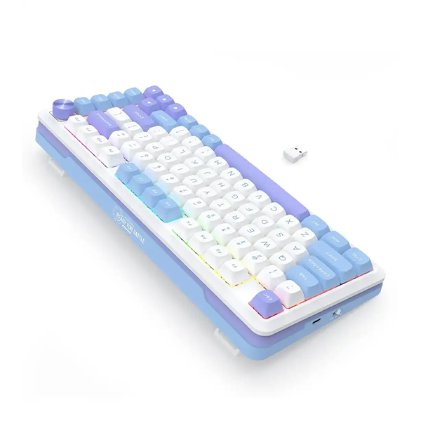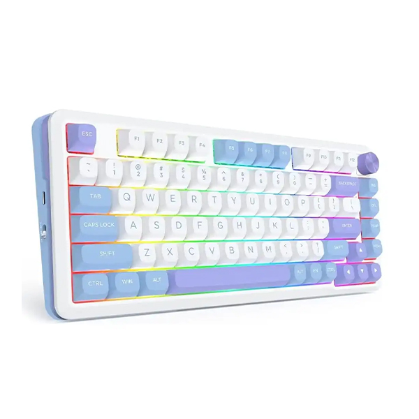 ✔️ فرم فاکتور 75 درصد (81 کلید) با ترکیب رنگی سفید، آبی و بنفش.