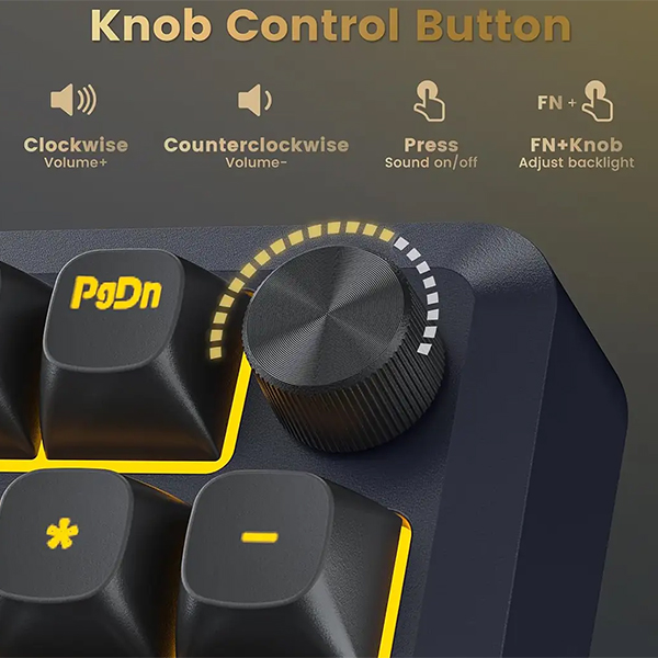K688 GB PRO دارای یک دکمه چرخشی چندمنظوره است که به شما اجازه میدهد به راحتی حجم صدا، نور پسزمینه و حالتهای نورپردازی را کنترل کنید، بدون نیاز به کلیدهای اضافی یا نرمافزارهای جانبی.