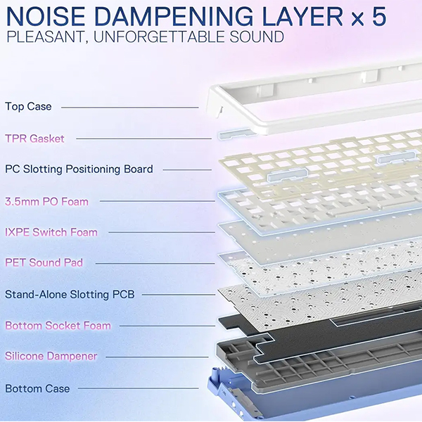 در داخل کیبورد K709 PRO WBP RGB پنج لایه جاذب صدا قرار داده شده است که به کاهش نویزهای اضافی کمک میکند. این لایهها شامل فوم PO با ضخامت 3.5 میلیمتر، فوم IXPE، پد صدا PET، فوم زیر سوکت، و پد سیلیکونی زیرین هستند. این لایهها باعث میشوند که صدای کلیدها هنگام فشرده شدن کمتر باشد و تمرکز بیشتری در هنگام بازی یا کار داشته باشید.