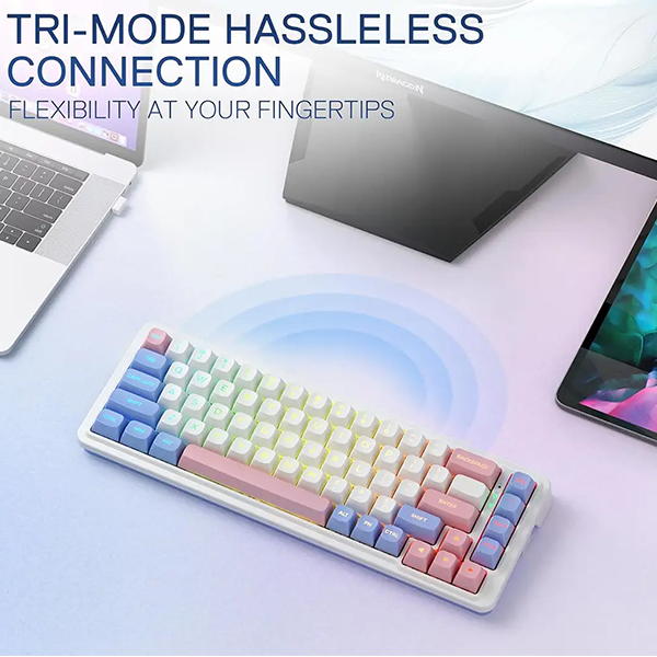 کیبورد K709 PRO WBP RGB با پشتیبانی از سه روش اتصال مختلف، انعطافپذیری بینظیری را برای شما فراهم میکند. شما میتوانید از طریق بلوتوث 3.0/5.0، دانگل USB 2.4GHz، و کابل USB-C به کامپیوتر، تبلت، یا گوشی هوشمند خود متصل شوید. همچنین، میتوانید به طور همزمان به چندین دستگاه مختلف متصل شوید و با استفاده از کلیدهای ترکیبی FN، به راحتی بین آنها جابجا شوید. این قابلیت به شما کمک میکند تا در هر شرایطی و با هر نوع دستگاهی به راحتی از کیبورد خود استفاده کنید.