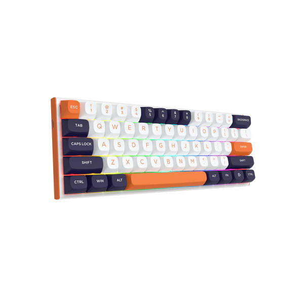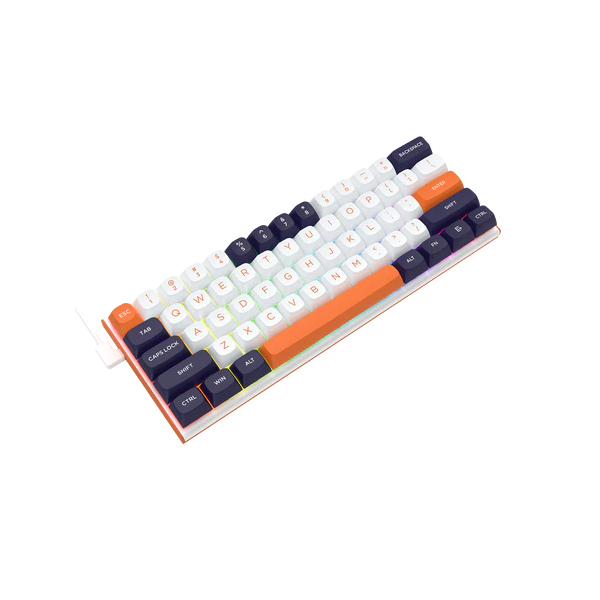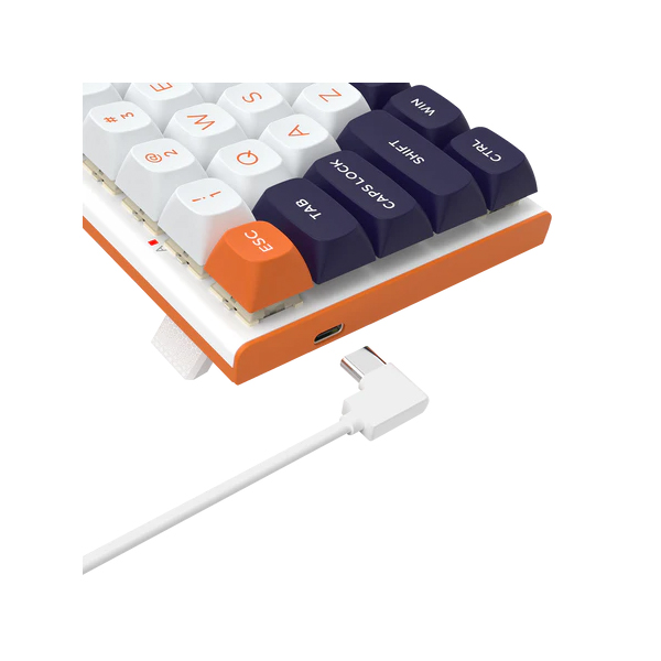 با ابعاد 12.6 × 5.51 × 0.18 اینچ و وزن تنها 1.32 پوند، این کیبورد بهراحتی قابلحمل است و فضای بسیار کمی را روی میز اشغال میکند. این طراحی فشرده مخصوصاً برای گیمرهایی که به فضای حرکت موس بیشتری نیاز دارند بسیار کارآمد است. همچنین ظاهر متفاوت و جذاب این مدل با رنگبندی سفید، آبی، مشکی و نارنجی، جلوهای خاص به میز کار یا ستاپ گیمینگ شما میبخشد.