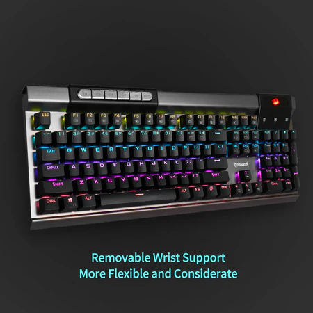 نورپردازی RGB قابل تنظیم یکی از اصلیترین نقاط قوت این کیبورد است. با 18 حالت مختلف نورپردازی و امکان تنظیم جلوهها متناسب با سلیقهی کاربر، K563 SURYA RGB جلوهای بینظیر به محیط کار یا میز گیمینگ شما میبخشد. حتی لوگوی Redragon نیز دارای نورپردازی جداگانه با سه حالت متفاوت است (خاموش، روشن و تنفسی) که زیبایی بیشتری به ظاهر این محصول بخشیده است.